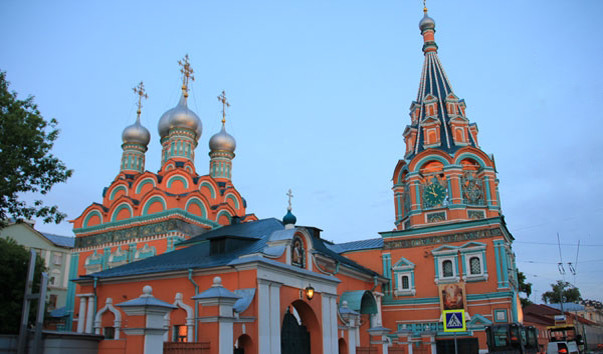 В конце 17 века деревянную церковь вытеснил величественный каменный храм, построенный на средства царя Алексея Михайловича. Строили новый храм лучшие зодчие того времени. В архитектурном смысле - это типичный московский пятикупольный храм с шатровой колокольней. Фасад украшен изразцами с затейливым растительным орнаментом. Ярко-раскрашенная церковь была настолько ослепительна, что ее нередко называли просто Красной, то есть красивой.